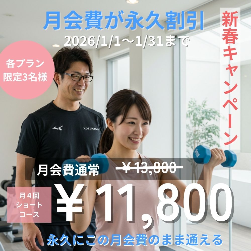 | 月4回ショート(1回25分) | ・毎月4回(1回25分)まで個室パーソナル指導でのトレーニング ・メンタルのサポートと、食事指導を実施 | 13,800円(税込み) ↓ 永久価格11,800円(税込み) 1/6現在 残り2名 |